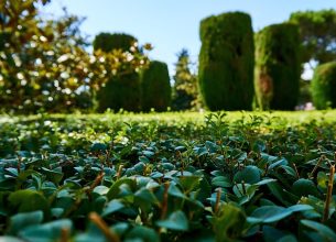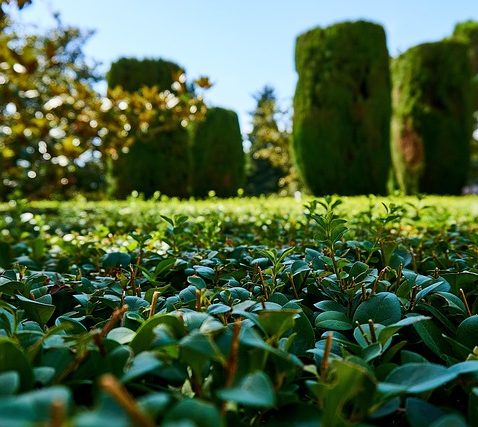 Immergrüne niedrige Hecke im Garten mit der Japanischer Spindelstrauch